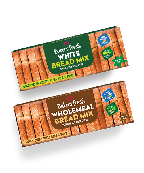Available in two different variants; the NEW Bakers Fresh Wholemeal Bread Mix and White Bread Mix are available in 1KG boxes. Each box comes with two yeast sachets. It’s easy to bake with simple instructions, ensuring a perfect bake, every time! The bread mixes can also be used to bake donuts, buns and pizza base too.
